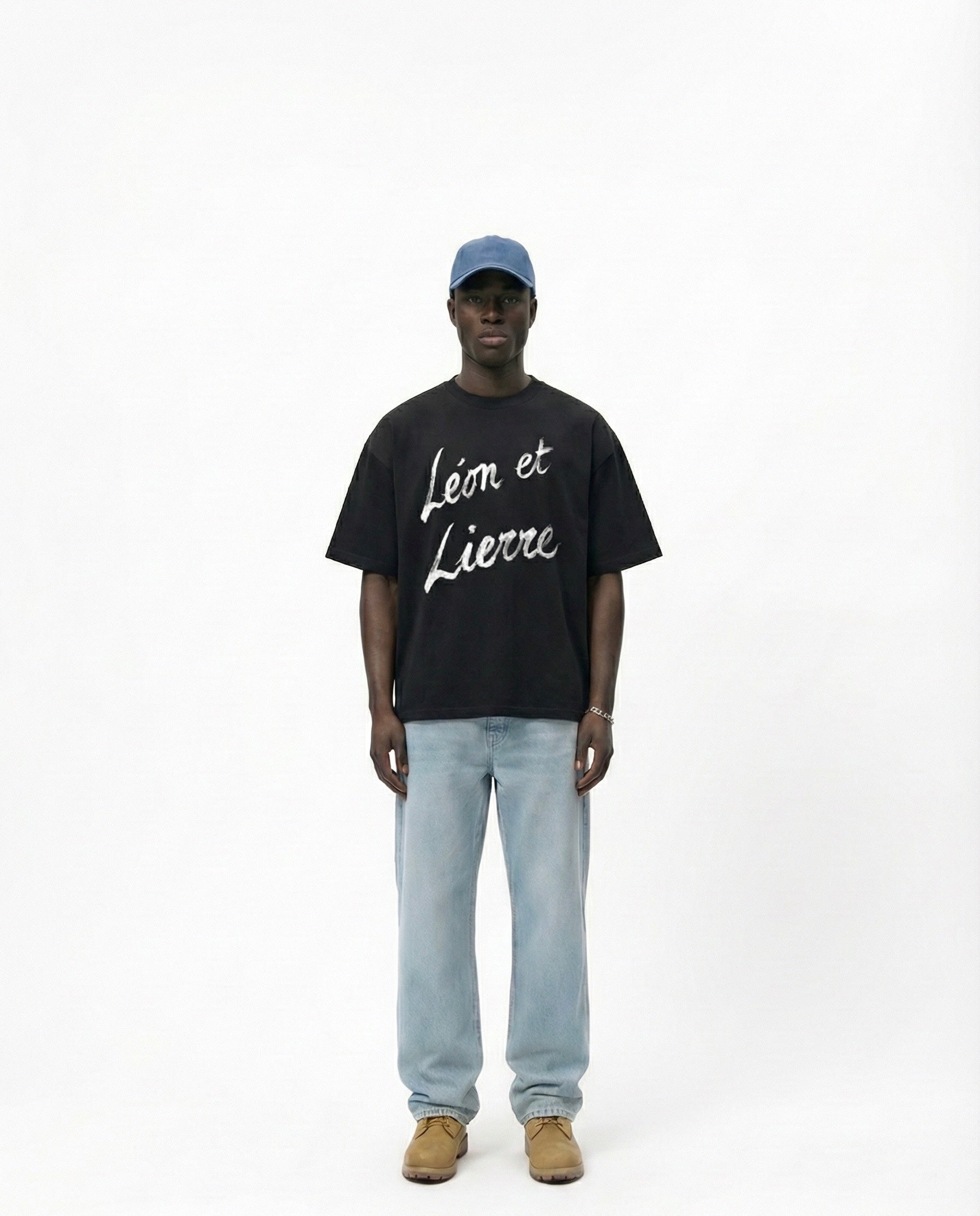 Defined by stark contrast and substantial structure. This tee is cut from heavyweight, dense cotton jersey in a deep midnight black, providing a boxy silhouette that holds its shape. Cutting across the chest is the "Léon et Lierre" script, printed in a thick, opaque white ink that delivers immediate visual impact. It’s a bold, minimalist essential designed for those who prefer their basics with a heavier hand and a relaxed drape.